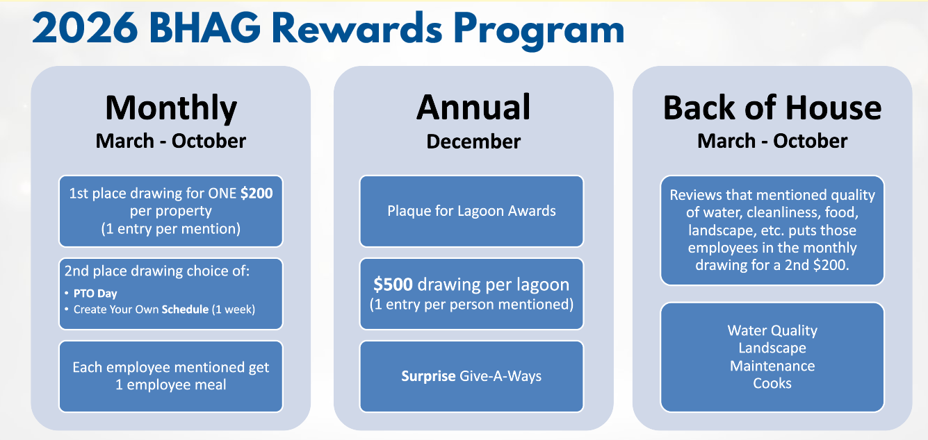 From now until October, every time a guest gives you a shoutout in a positive Google review, you’re automatically entered in a drawing to win great prizes including $500, PTO days, and some fun surprises.